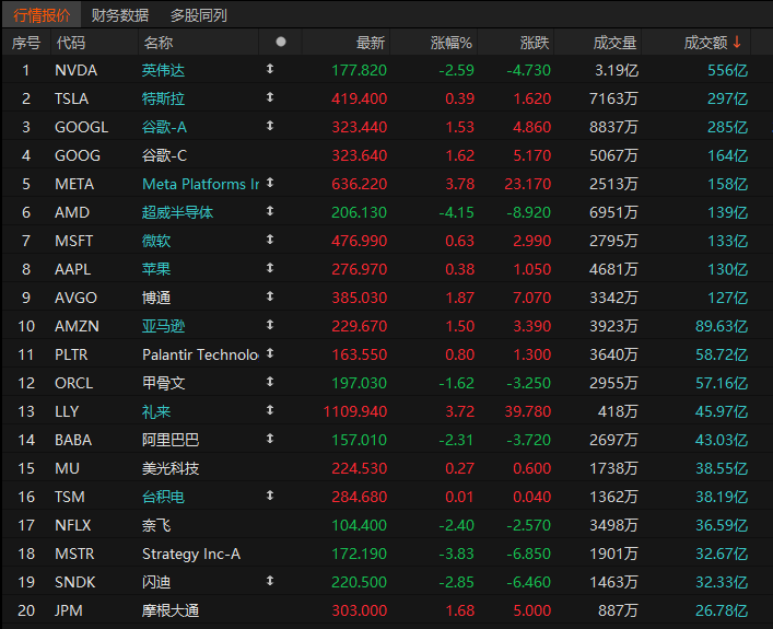 美股成交额前20:英伟达收跌2.59% Meta可能与谷歌达成协议