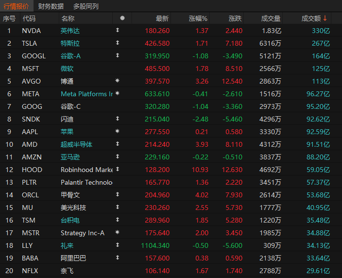第19名阿里巴巴收高0.38%,成交33.64亿美元。