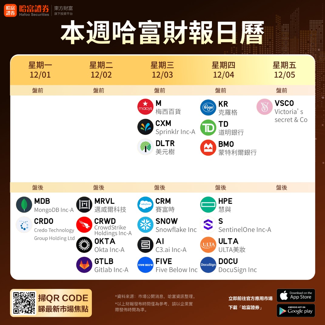 与此同时,半导体代表迈威尔科技 (MRVL.US)将于本周发布业绩,作为除英伟达 (NVDA.US)外的重要AI芯片参与者,其在定制化芯片、数据中心网络领域的动向备受关注。此外,零售股梅西百货 (M.US) 、克罗格 (KR.US)等也将发布业绩。