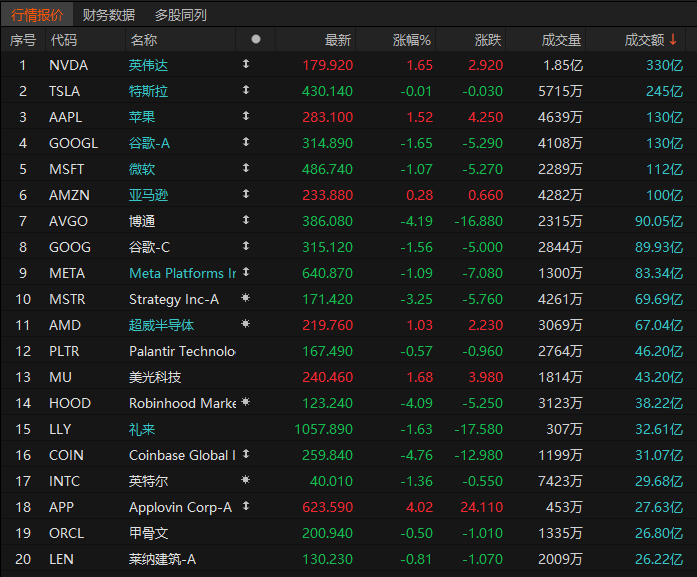周一美股成交额第1名英伟达收高1.65%,成交330亿美元。英伟达于周一宣布,已收购新思科技价值20亿美元的普通股,每股价格为414.79美元。此次入股是双方战略合作的一部分,旨在加速计算与人工智能工程解决方案的开发。