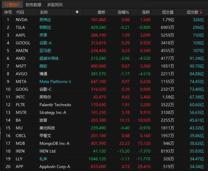 第11名英特尔收高8.65%,成交67.38亿美元。英特尔14A制程节点获两家潜在代工客户正面反馈,客户对其开发进展“非常满意”。该节点有望在数据中心、PC及移动芯片市场发挥作用,英特尔正以High-NA EUV技术攻关14A,旨在成为首家完成High-NA技术跨越的厂商。