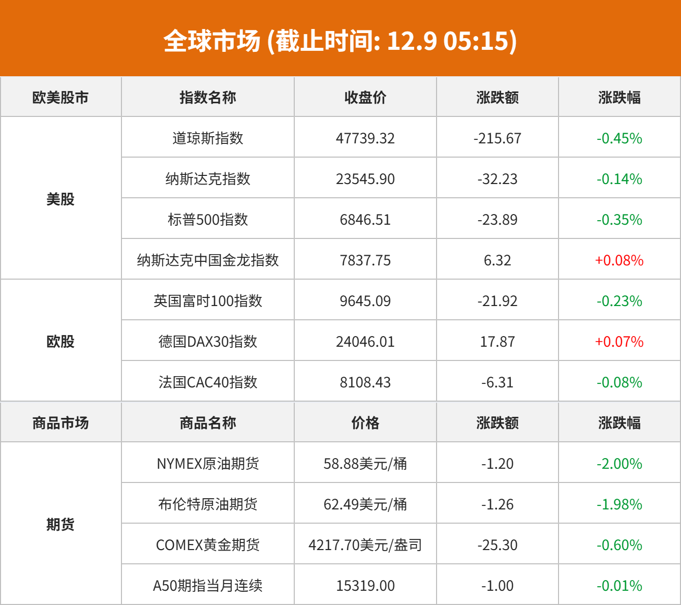 美股市场:美股三大指数12月08日收盘全线下跌。截至收盘,道琼斯工业平均指数比前一交易日下跌215.67点,收于47739.32点,跌幅为0.45%;标准普尔500种股票指数下跌23.89点,收于6846.51点,跌幅为0.35%;纳斯达克综合指数下跌32.23点,收于23545.9点,跌幅为0.14%。