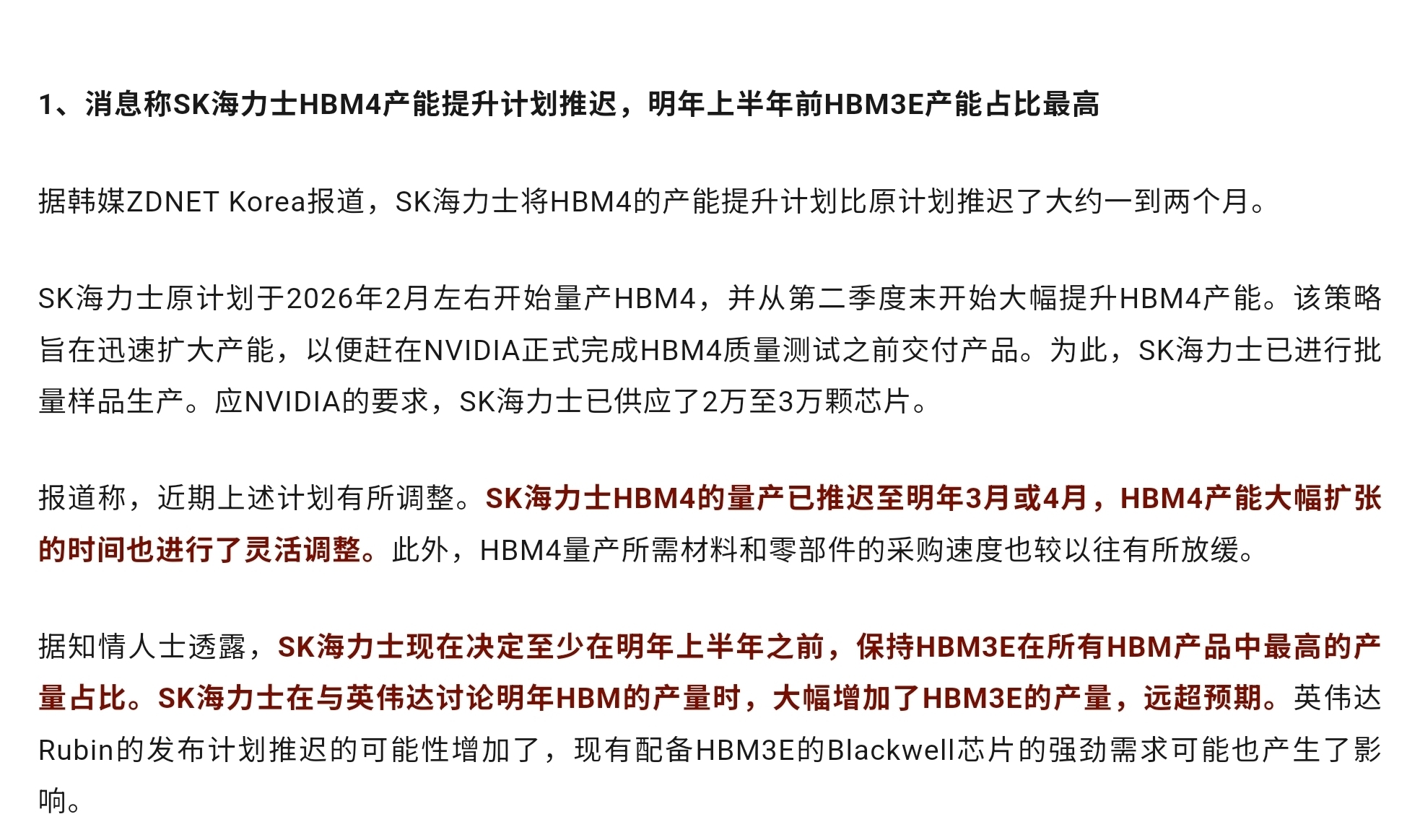 $英伟达(NASDAQ|NVDA)$ 怪不得下跌,重磅消息海力士推迟量产HBM4!