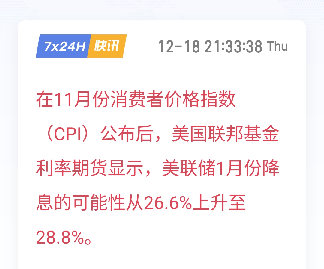 $英伟达(NASDAQ|NVDA)$ $纳斯达克(QQZS|NDX)$ 美国联邦基金利率期货显示,美联储1月份降息的可能性从26.6%上升至28.8%