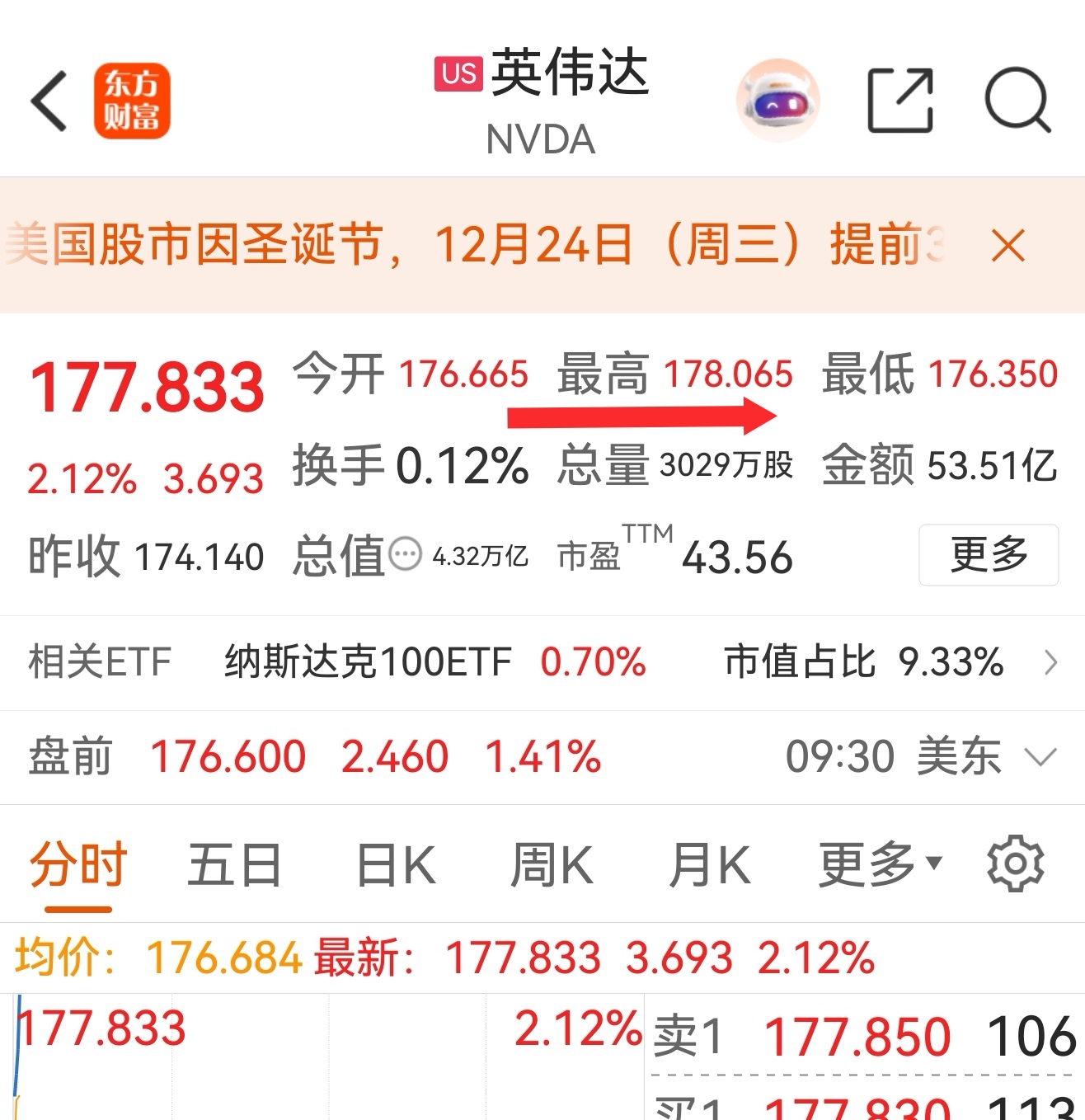 不过多头也不会闲着,看英伟达K线,反弹一触及发,在20分钟形成底部结构后,股价将会跨越178。也就是今天跌多少,后续会涨多少。