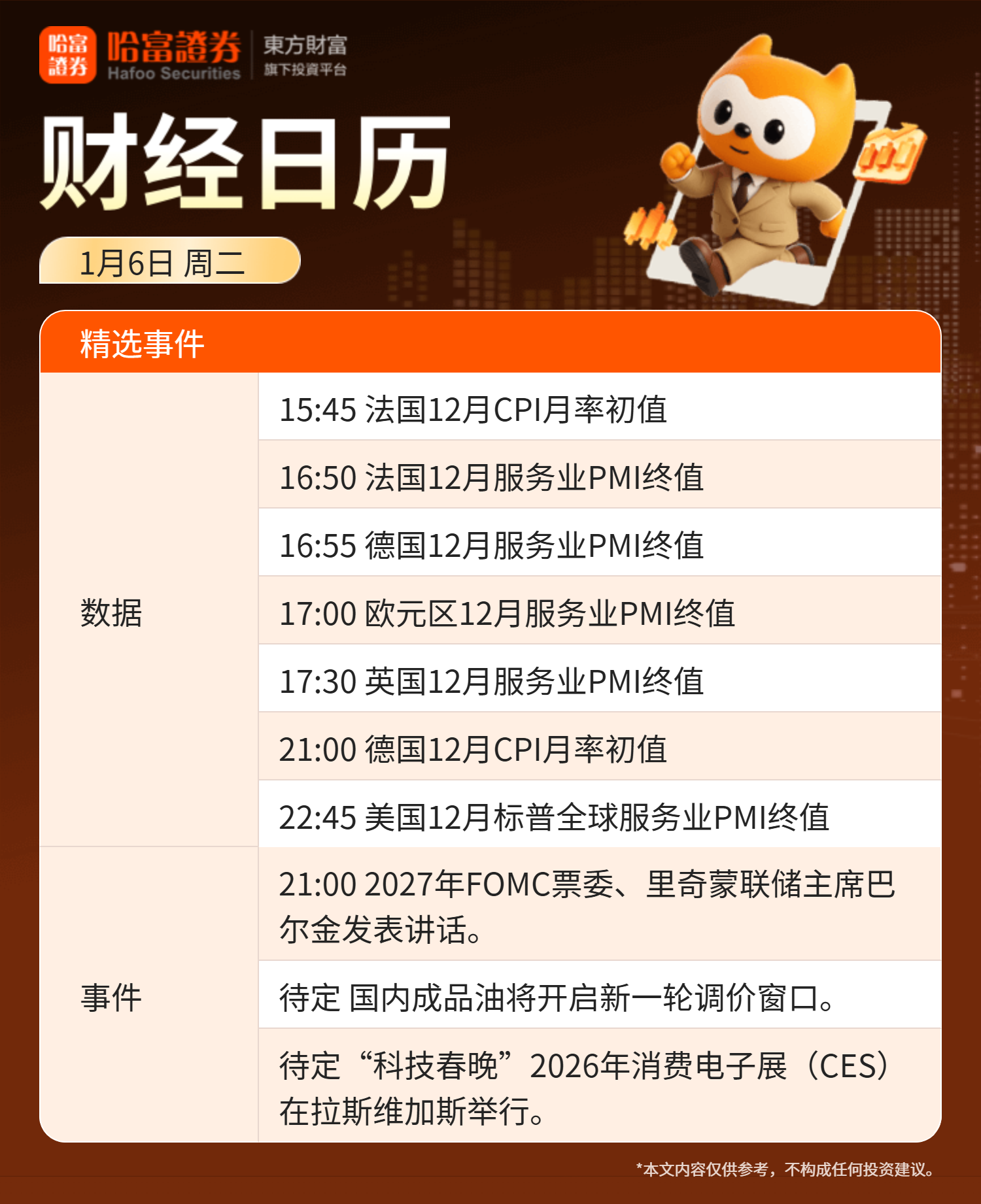 商品市场:COMEX黄金期货当月连续合约上涨130.10美元,涨幅3.00%,报4459.7美元/盎司。COMEX白银期货当月连续合约上涨5.495美元,涨幅7.74%,报76.51美元/盎司。现货白银上涨3.95美元,涨幅5.44%,报76.61美元/盎司。伦铜期货历史首次触及每吨13000美元的整数关口,截至收盘,伦铜上涨618美元,涨幅4.96%,报13087.5美元/吨。国际油价01月05日上涨。截至当天收盘,纽约商品交易所WTI原油期货当月连续合约上涨1.03美元,收于每桶58.35美元,涨幅为1.80%。