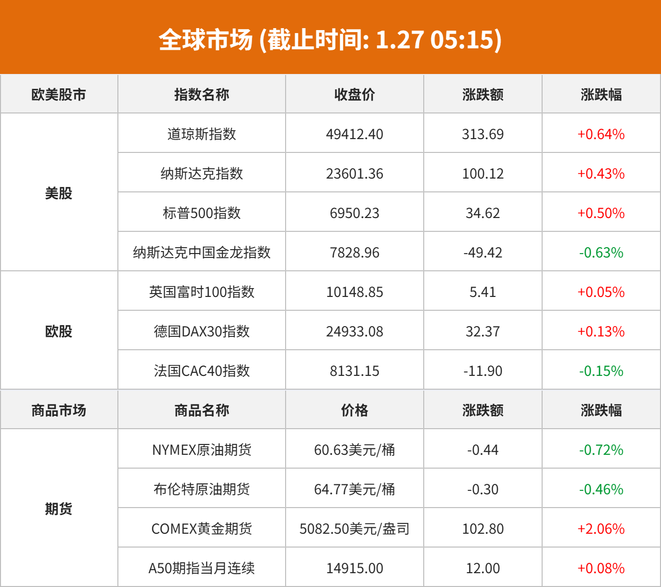 商品市场:黄金、白银、铂金在刷新历史高点后回调,纽约期金一度涨超2%,纽约期银一度涨超16%。COMEX黄金期货当月连续合约上涨25.10美元,涨幅0.50%,报5004.8美元/盎司。COMEX白银期货当月连续合约上涨2.56美元,涨幅2.52%,报103.89美元/盎司。现货黄金上涨25.44美元,涨幅0.51%,报5008.35美元/盎司。现货白银上涨0.89美元,涨幅0.86%,报103.86美元/盎司。NYMEX铂金期货当月连续合约下跌165.7美元,跌幅6.04%,报2575.6美元/盎司。国际油价01月26日下跌。截至当天收盘,纽约商品交易所WTI原油期货当月连续合约下跌0.24美元,收于每桶60.83美元,跌幅为0.39%。