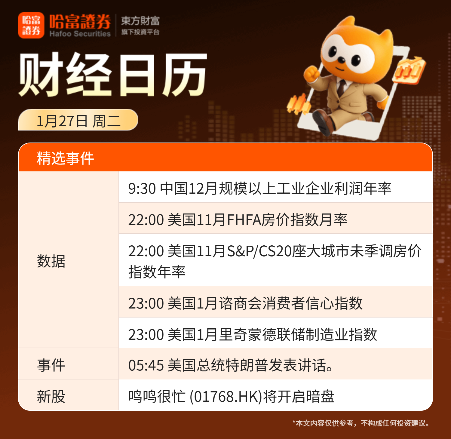 大型科技股涨跌互现,苹果、甲骨文涨近3%,Meta涨超2%,谷歌涨超1%,英特尔跌超5%,AMD、特斯拉跌超3%,英伟达、台积电小幅下跌。美股医保概念股盘后普跌,CVS跌超11%,哈门那跌超13%,联合健康跌超10%。有消息称,白宫提议2027年医疗保险向保险公司支付的费率不变,低于市场预期。大型银行股普涨,摩根士丹利、高盛、富国银行、摩根大通、花旗集团均涨超1%。