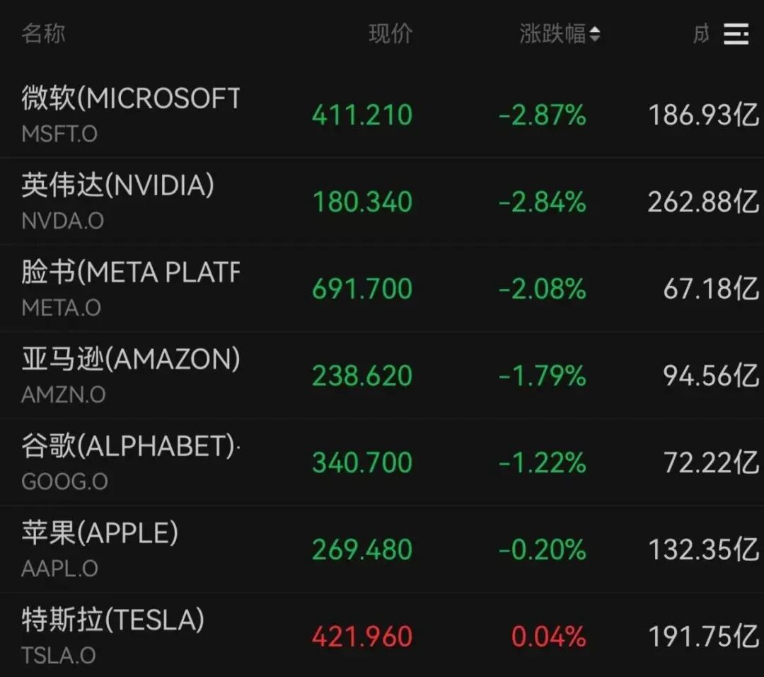 美股科技七巨头中,仅微软收涨,英伟达、脸书、亚马逊跌幅均超过2%。