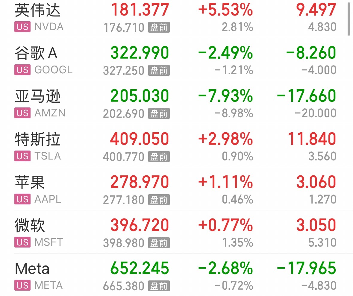 大型科技股多数上涨,英伟达涨超5%,特斯拉涨近3%,苹果涨超1%,微软涨0.77%,谷歌、Meta跌超2%。