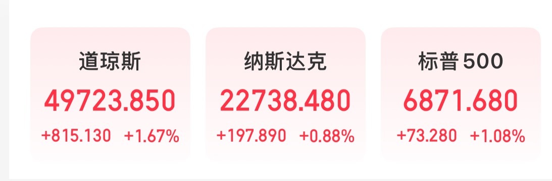 美股三大指数集体高开,截至发稿,道指、标普500指数涨幅均扩大至逾1%,纳指涨0.88%。