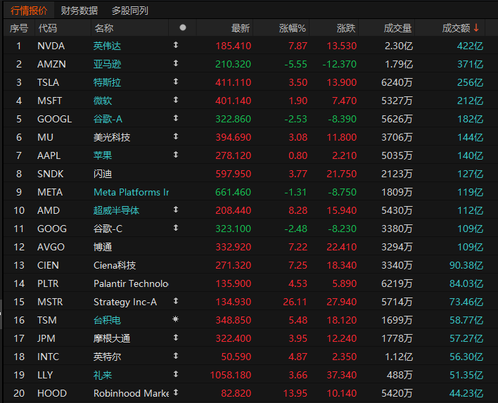 周五美股成交额第1名英伟达收高7.87%,成交422亿美元。此前该股已连续第五个交易日下跌,累计下跌10.72%。