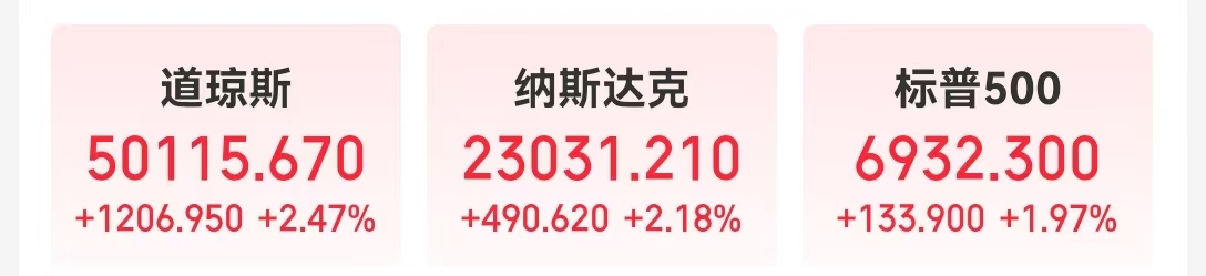 当地时间2月6日,美股三大指数集体收涨,道指上涨1206.95点,涨幅2.47%,站上50000点创收盘新高;纳指涨2.18%;,标普500指数涨1.97%。