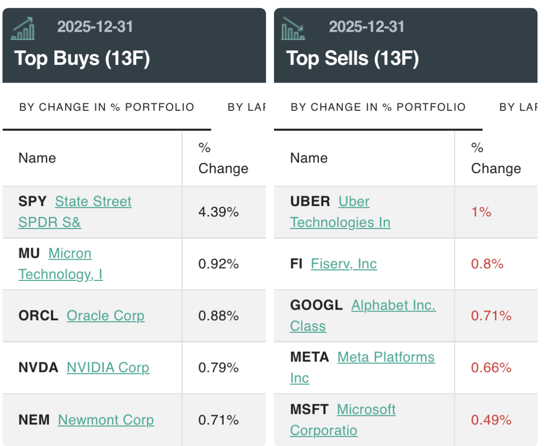 2025年第四季度,桥水基金增持最多的五大标的分别是标普500指数ETF-SPDR(SPY.US)、美光科技、甲骨文、英伟达和全球最大的黄金生产商之一纽蒙特矿业(Newmont Corporation.)。