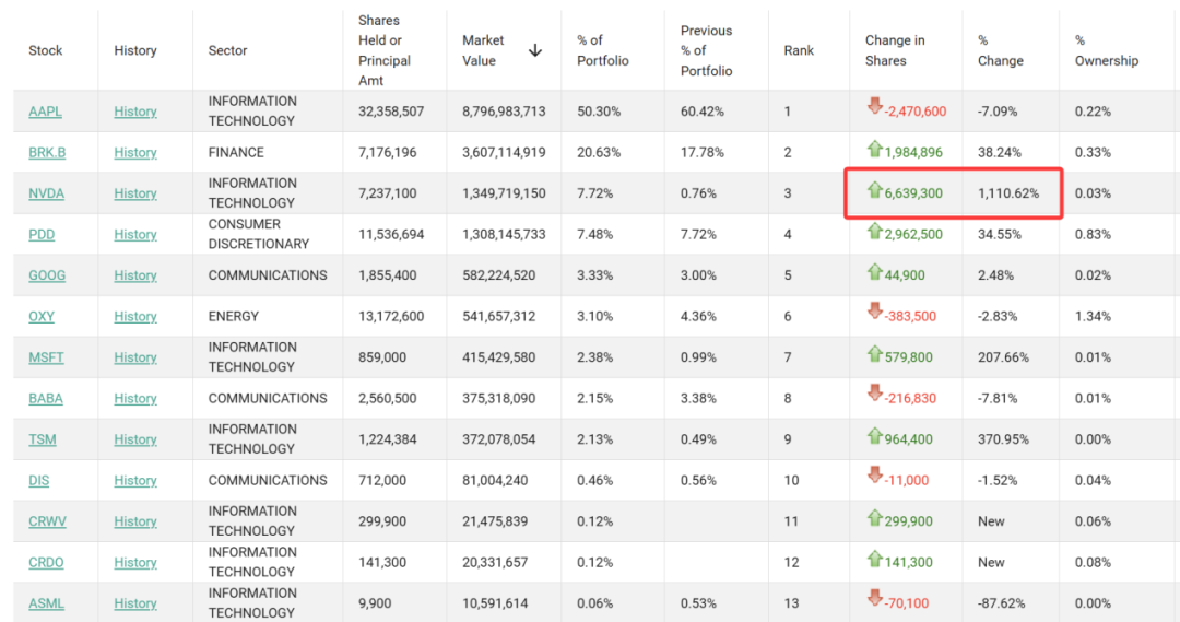 在2025年第一季度建仓英伟达之后,段永平在第四季度突然再度出手,大举增持663.93万股,持仓数量激增1110.62%,总持股数达到723.71万股,持仓市值跃升至13.5亿美元,成为其投资组合中的第三大重仓股(占比为7.72%,前一季度仅为0.76%)。