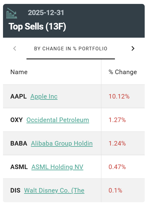 13F持仓披露显示,2025年四季度,段永平减持了苹果、西方石油、阿里巴巴、迪士尼、阿斯麦。