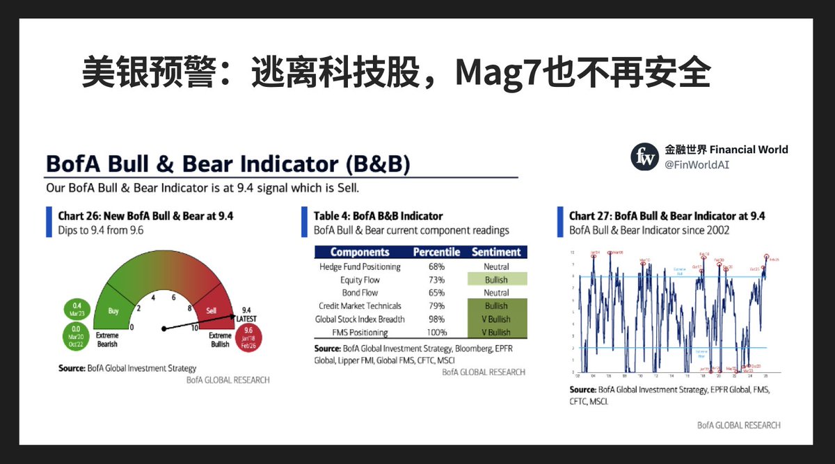 如果你从2025年10月开始持有英伟达,那你到现在持有收益基本为0。这不是个股问题,而是整个科技叙事开始失效。美银已经直接预警:撤离科技股,Mag7也不再安全。原因很简单。2026年科技巨头在AI上的资本开支预计冲到6700亿美元,相当于它们合并现金储备的96%,而2023年这个比例只有40%。所谓轻资产、高回报、无限回购的黄金模型,正在被巨额Capex彻底击穿。科技公司正在被迫走向重资产化,资产负债表变重,自由现金流被吞噬,估值逻辑开始向传统工业靠拢。
