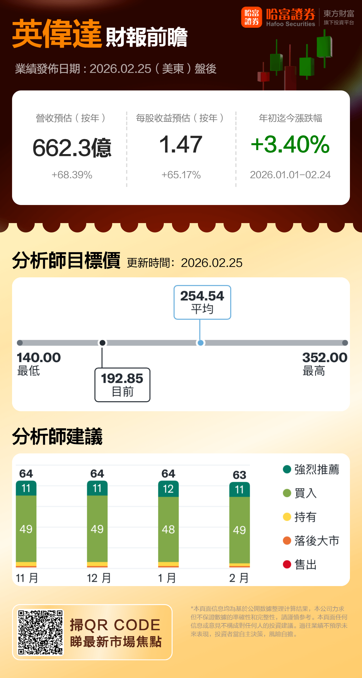 英伟达将于美东时间2月25日(本周三)盘后发布财报,2026财年第四季度预计实现营收662.3亿美元,同比增加68.39%;预期每股收益1.47美元,同比增加65.17%。(上述数据使用的会计准则为US-GAAP)