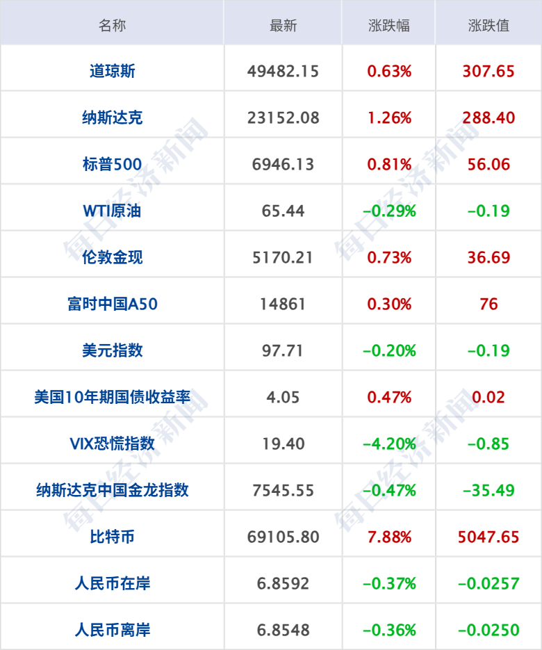 美股三大指数集体收涨,纳指涨1.26%,标普500指数涨0.81%,道指涨0.63%,大型科技股全线上涨,奈飞涨约6%,微软、Meta涨超2%,英伟达、英特尔、特斯拉、亚马逊涨超1%,苹果、谷歌小幅上涨。加密货币概念股普涨,Circle涨超35%,Coinbase涨超13%,BMNR涨超10%,Strategy涨超8%,Robinhood涨超5%。中概股涨跌不一,纳斯达克中国金龙指数跌0.47%,富途控股涨逾5%,老虎证券涨近4%,贝壳涨近3%,新东方跌逾5%,百济神州跌逾4%。