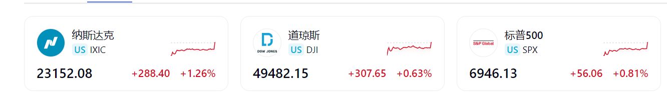 美东时间周三(25日),美国三大股指全线收涨,道指涨0.63%,标普500指数涨0.81%,纳指涨1.26%。