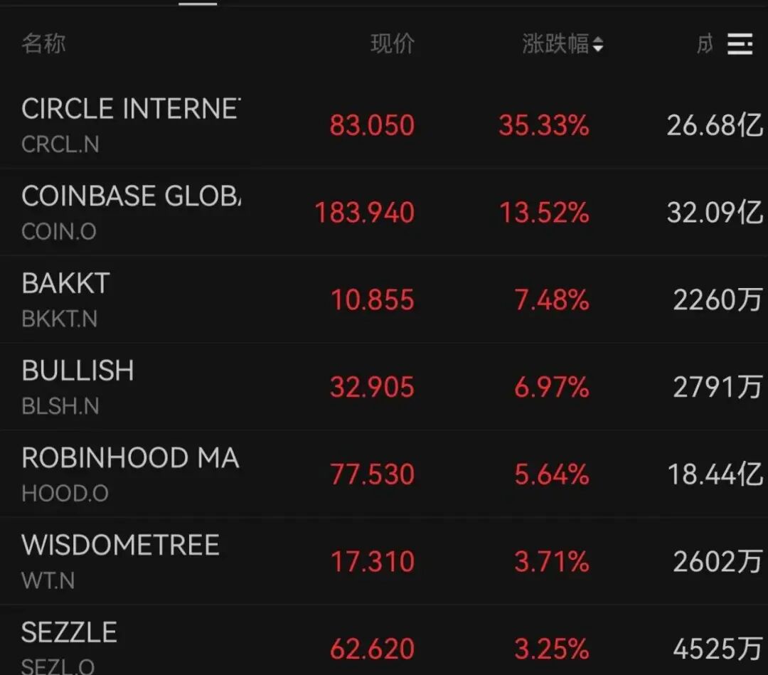 稳定币概念股走强,Circle暴涨35.33%,Coinbase上涨13.52%。