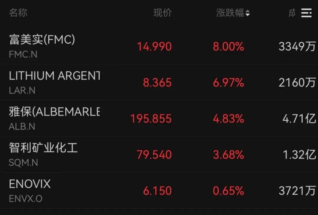 受该消息刺激,锂矿股上涨,全球领先的锂生产商Sigma Lithium涨近30%,富美实涨8%,雅保涨4.83%,智利矿业化工涨3.68%。