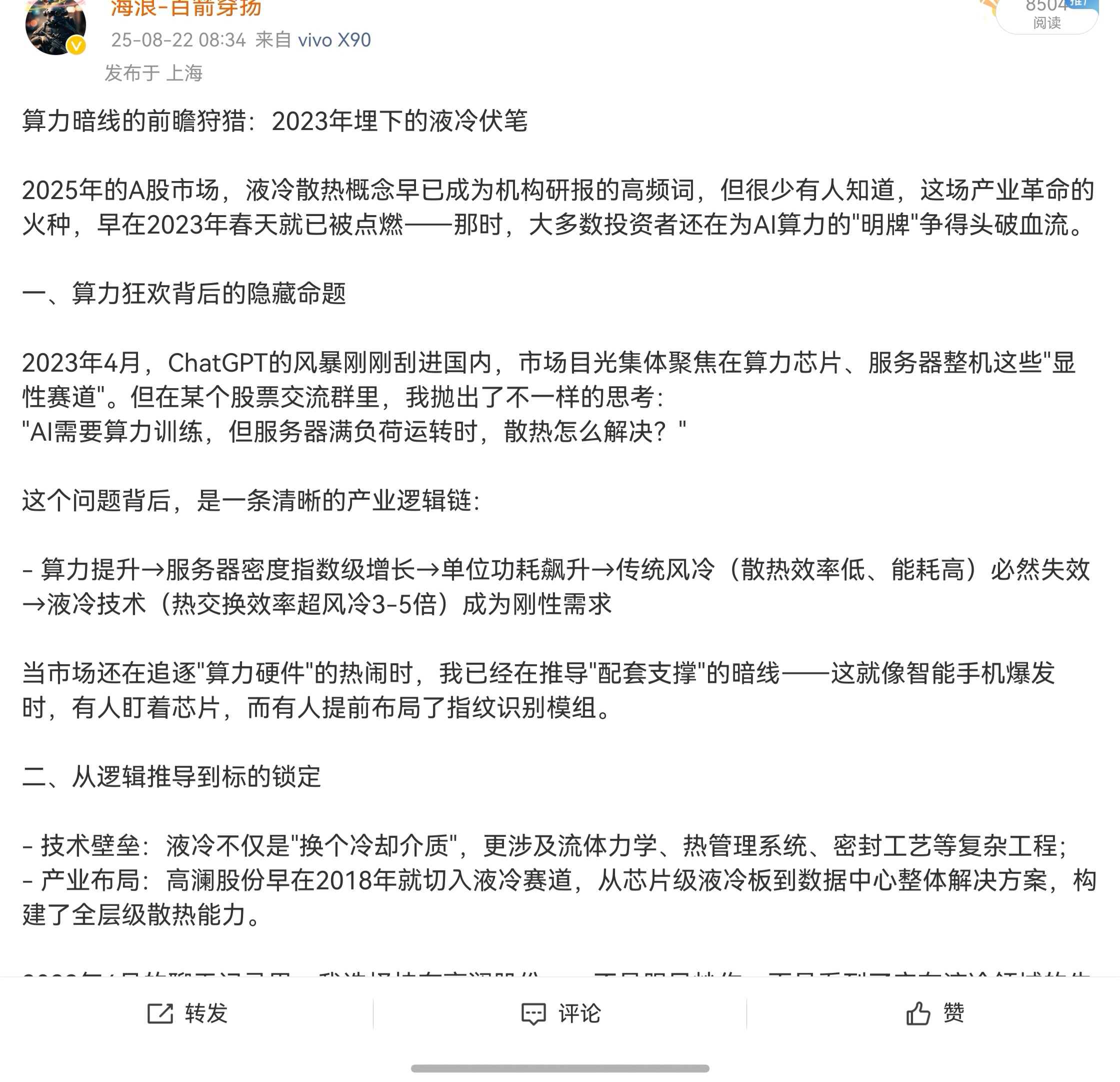 有人说我“研究不够深”,但其实当时对液冷的逻辑推导是对的:算力爆发→散热刚需→液冷渗透,这个逻辑后来被市场完美验证。