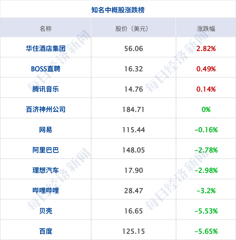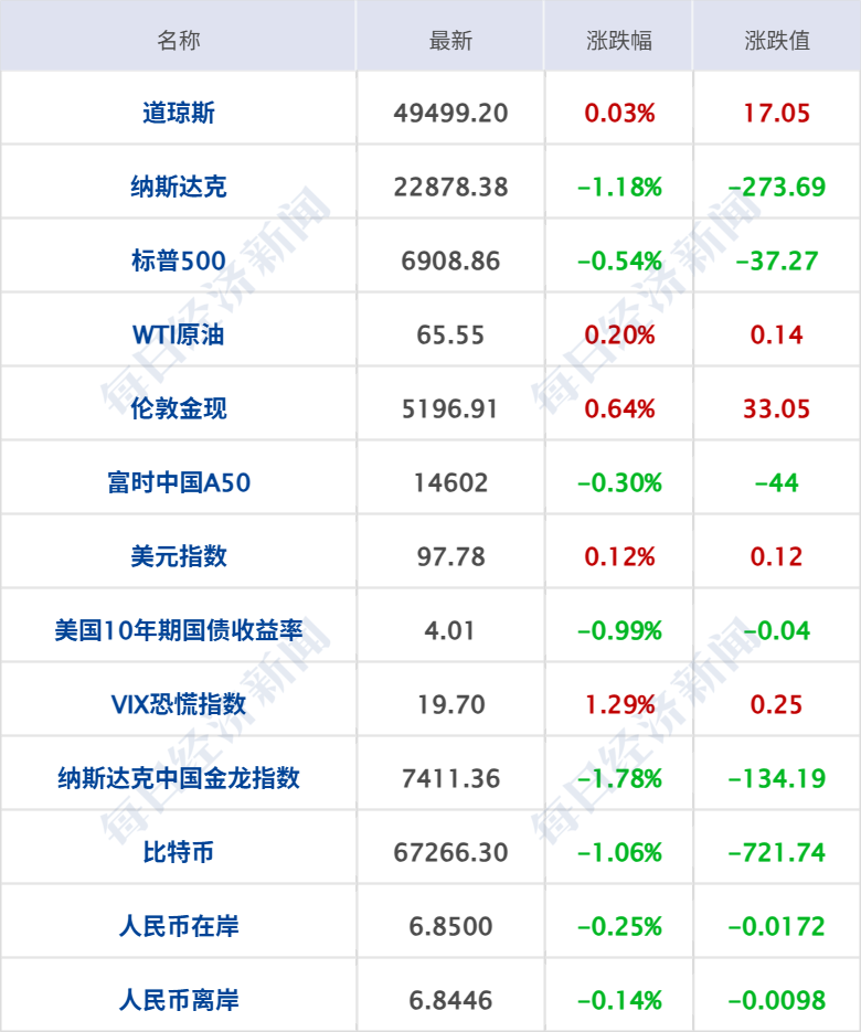 美股三大指数收盘涨跌不一,纳指跌1.18%,标普500指数跌0.54%,道指涨0.03%,大型科技股多数下跌,英伟达跌超5%,市值蒸发2592亿美元(约合人民币1.77万亿元),创去年4月16日以来最大单日跌幅;英特尔跌逾3%,特斯拉跌超2%,谷歌、亚马逊跌超1%,苹果小幅下跌;奈飞涨超2%,微软、Meta小幅上涨。中概股多数下跌,纳斯达克中国金龙指数跌1.78%,百济神州跌逾8%,万国数据跌超7%,百度集团、贝壳跌逾5%。