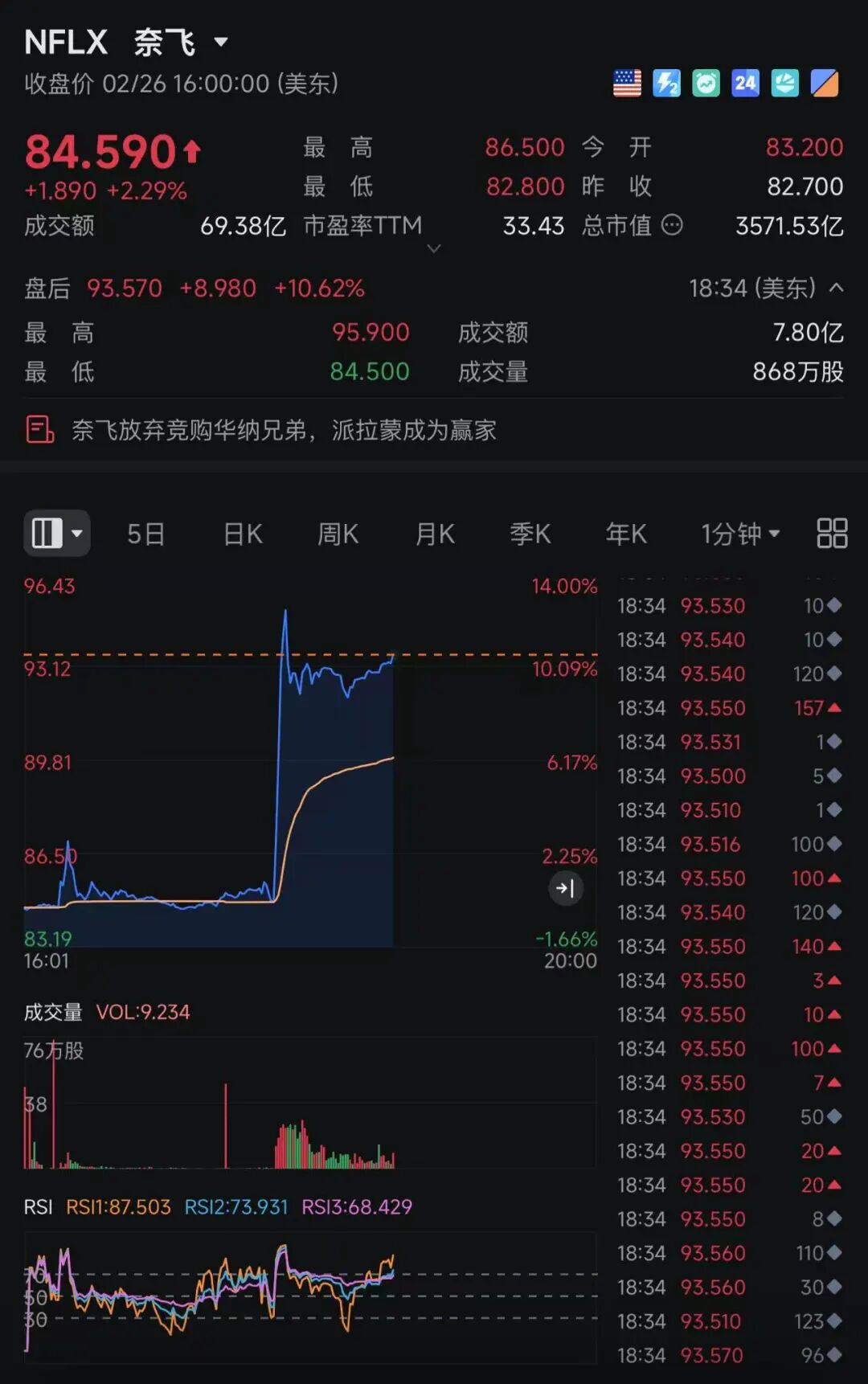 此外,奈飞盘后一度涨超13%,受到市场关注。消息面上,奈飞收购华纳兄弟的道路不平坦。华纳兄弟探索公司认为派拉蒙天舞的最新收购报价优于奈飞,要求奈飞修改竞价或放弃竞争,而奈飞则拒绝跟进报价。