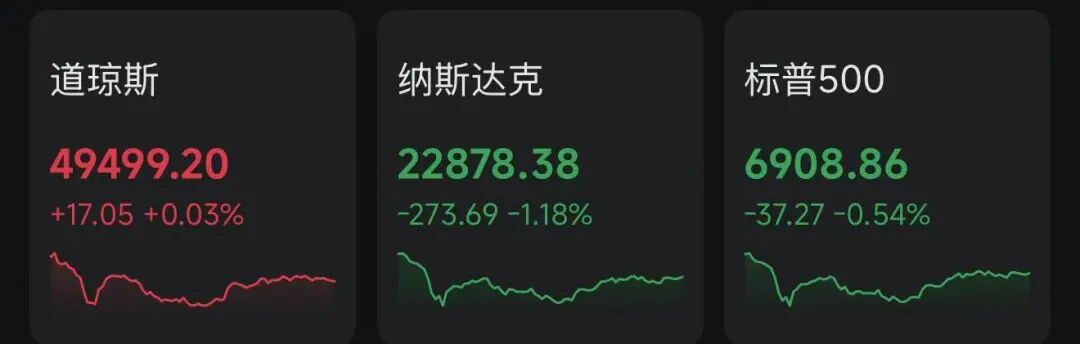 受英伟达大跌“拖累”,美股市场表现平淡,纳指跌超1%。截至收盘,道指涨17.05点,涨幅0.03%,报49499.20点;纳指跌273.69点,跌幅1.18%,报22878.38点;标普500指数跌37.27点,跌幅0.54%,报6908.86点。
