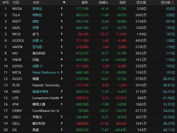 周五美股成交额第1名英伟达收跌4.16%,成交553亿美元。