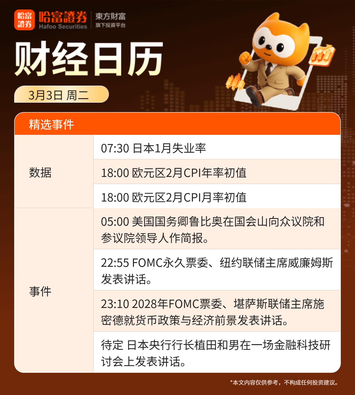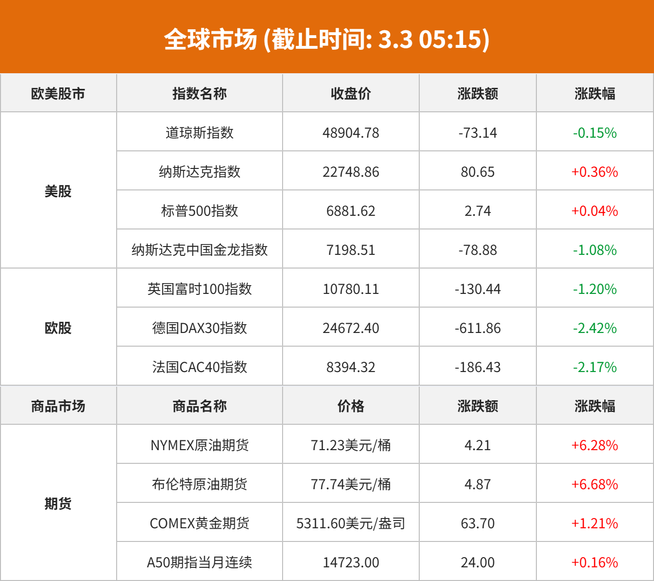 商品市场:国际油价03月02日上涨。截至当天收盘,纽约商品交易所WTI原油期货当月连续合约上涨4.01美元,收于每桶71.03美元,涨幅为5.98%。COMEX黄金期货当月连续合约上涨88.00美元,涨幅1.68%,报5335.9美元/盎司。COMEX白银期货当月连续合约下跌3.68美元,跌幅3.95%,报89.61美元/盎司。现货黄金上涨42.90美元,涨幅0.81%,报5322.12美元/盎司。现货白银下跌4.48美元,跌幅4.77%,报89.36美元/盎司。