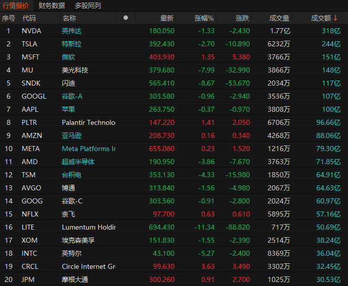 第4名美光收跌7.99%,成交148亿美元。周二美股芯片存储板块大跌,此前摩根士丹利称市场对存储芯片的偏爱过头了。摩根士丹利发表研报,将英伟达重新列为半导体板块首选标的,取代了此前的首选美光科技。