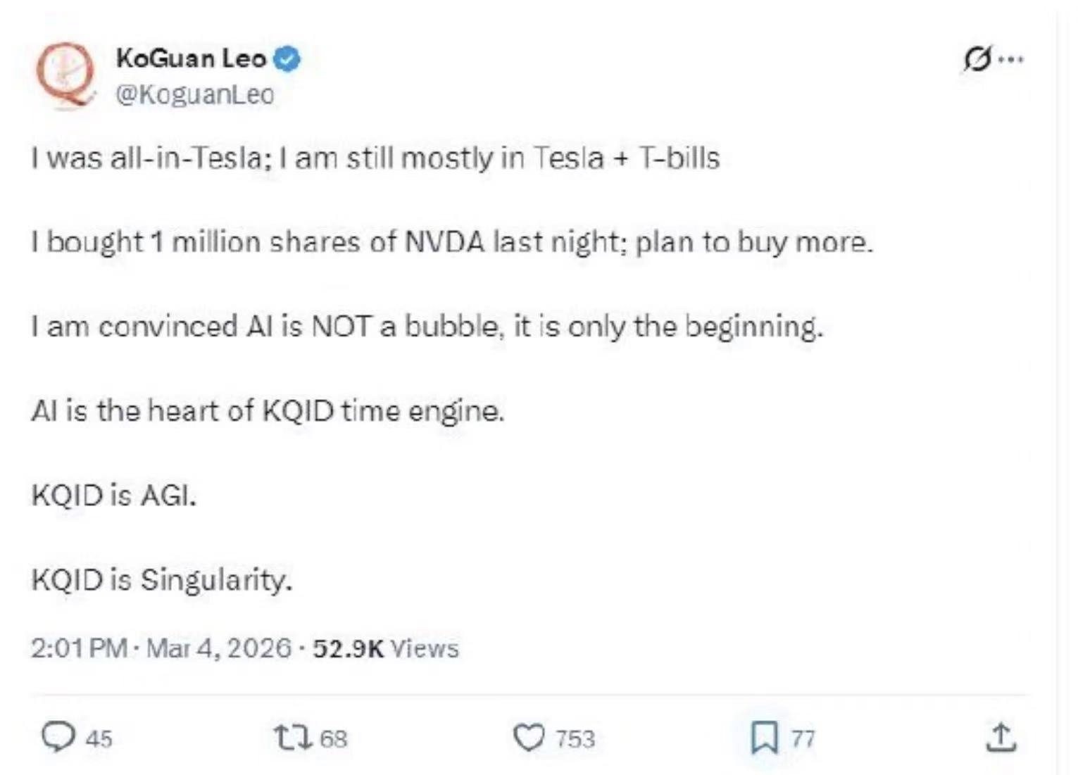 当地时间3月4日,华裔富豪廖凯原(Leo KoGuan)在社交平台上宣布,已买入100万股英伟达股票。英伟达周二在纽约收于180.05美元,这意味着其耗资约1.8亿美元。他在其个人账号上写道:“我坚信人工智能没有泡沫,它才刚刚起步。”