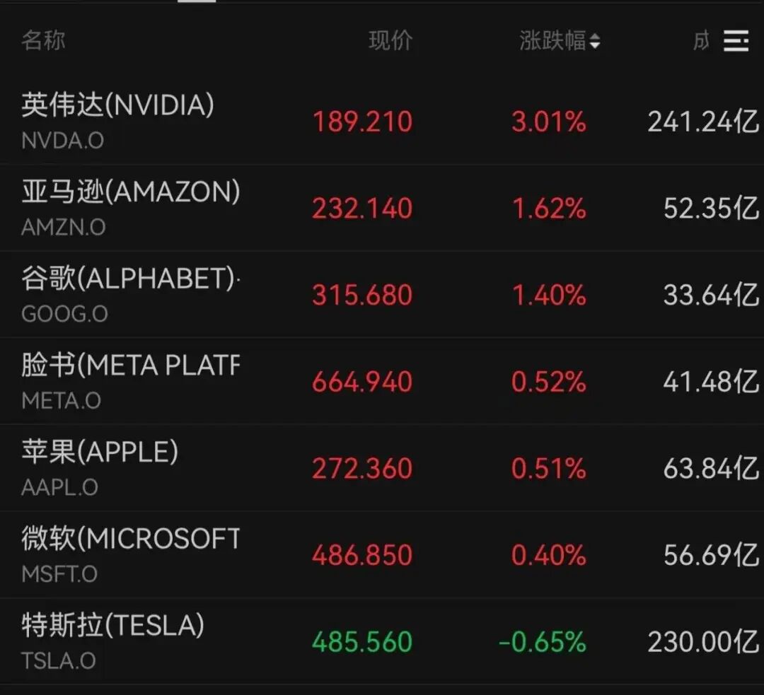 大型科技股整体走强。英伟达涨超3%,市值重回4.6万亿美元上方;亚马逊、谷歌、脸书等均收涨。