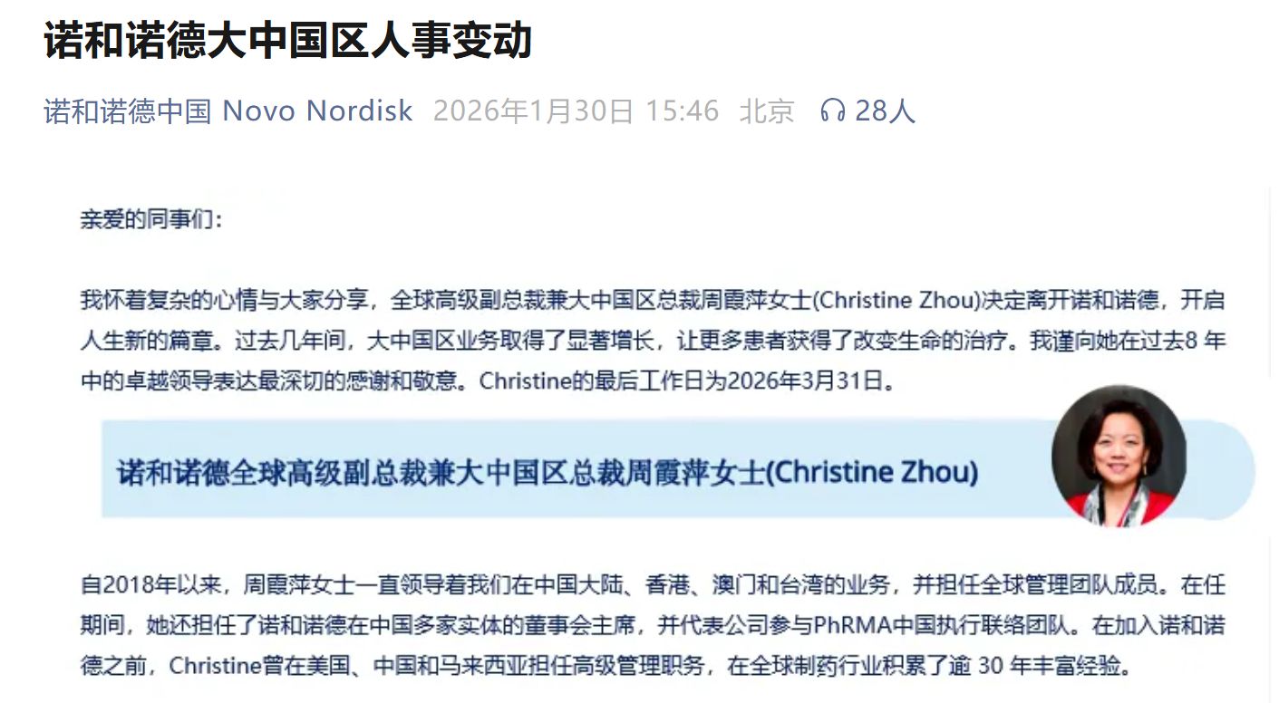 在管理层层面,诺和诺德也进行了一系列调整。就在上周五(1月30日),诺和诺德中国微信公众号发文称,全球高级副总裁兼大中国区总裁周霞萍女士 (Christine Zhou)将离开诺和诺德,最后工作日为2026年3月31日。同时,蔡琰(Yan Cai)被任命为大中国区新任高级副总裁兼大中国区总裁。