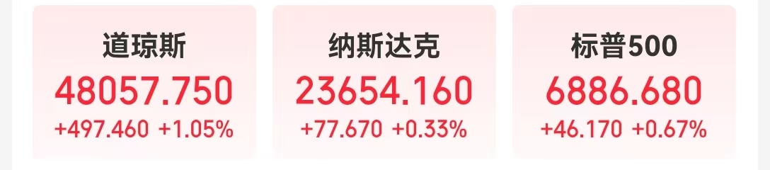 市场方面。截至当地时间12月10日收盘,美股三大指数集体收涨,道指上涨497.46点,涨幅1.05%;纳指涨0.33%;标普500指数涨0.68%。