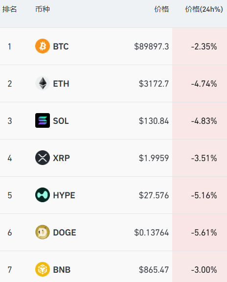 加密货币同样集体下挫,比特币跌破90000美元关口,最新报89897.3美元/枚,过去24小时,全市场超15万人被爆仓。