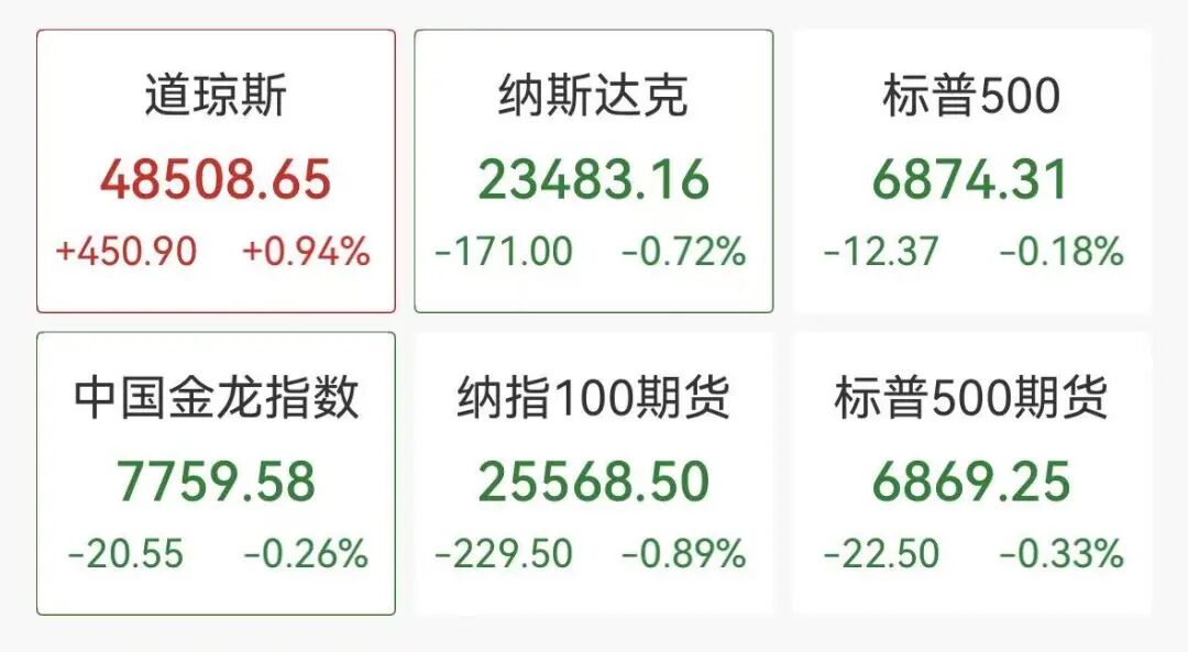 大型科技股跌多涨少,其中,甲骨文一度跌超16%,市值蒸发约1020亿美元(约合人民币7200亿元),截至发稿跌幅收窄至13%。消息面上,甲骨文第二财季业绩显示,公司营收、云业务收入均不及市场预期。此外,英伟达、AMD跌超3%,英特尔跌超2%,特斯拉、苹果、谷歌跌超1%。