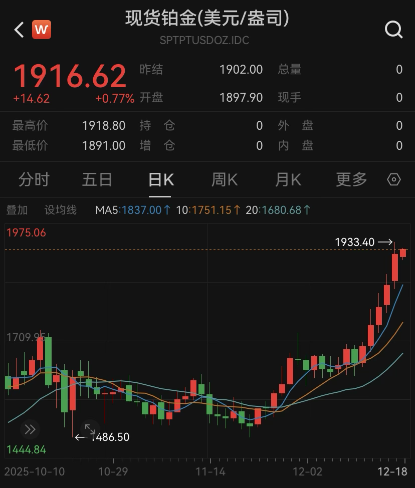 现货黄金价格当地时间12月17日涨近1%,逼近10月下旬创下的历史高位。白银时隔两个交易日再创盘中历史新高,现货白银价格盘中最高触及66.893美元/盎司,纽约期银一度涨超6%。现货铂金连涨五个交易日,触及2011年以来高位。