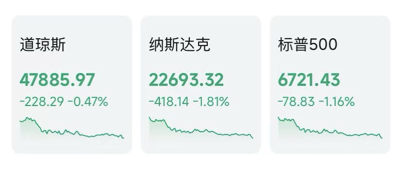 当地时间12月17日,美股主要指数全线收跌。截至收盘,道指跌0.47%报47885.97点,标普500指数跌1.16%报6721.43点,纳指跌1.81%报22693.32点。