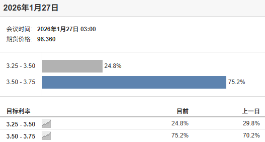 不过,从美联储利率观测工具来看,美联储2026年1月议息会议上,美联储保持利率不变的概率为75.2%,较前一日增加约5个百分点。
