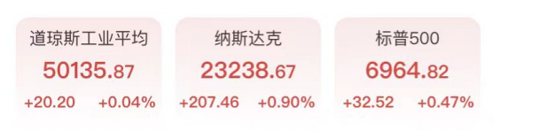 周一美股全线上涨,科技股企稳回升,投资者静待新一轮关键数据出炉。截至收盘,道指涨20.20点,涨幅0.04%,报50135.87点,纳指涨0.90%,报23238.67点,标普500指数涨0.47%,报6964.82点。