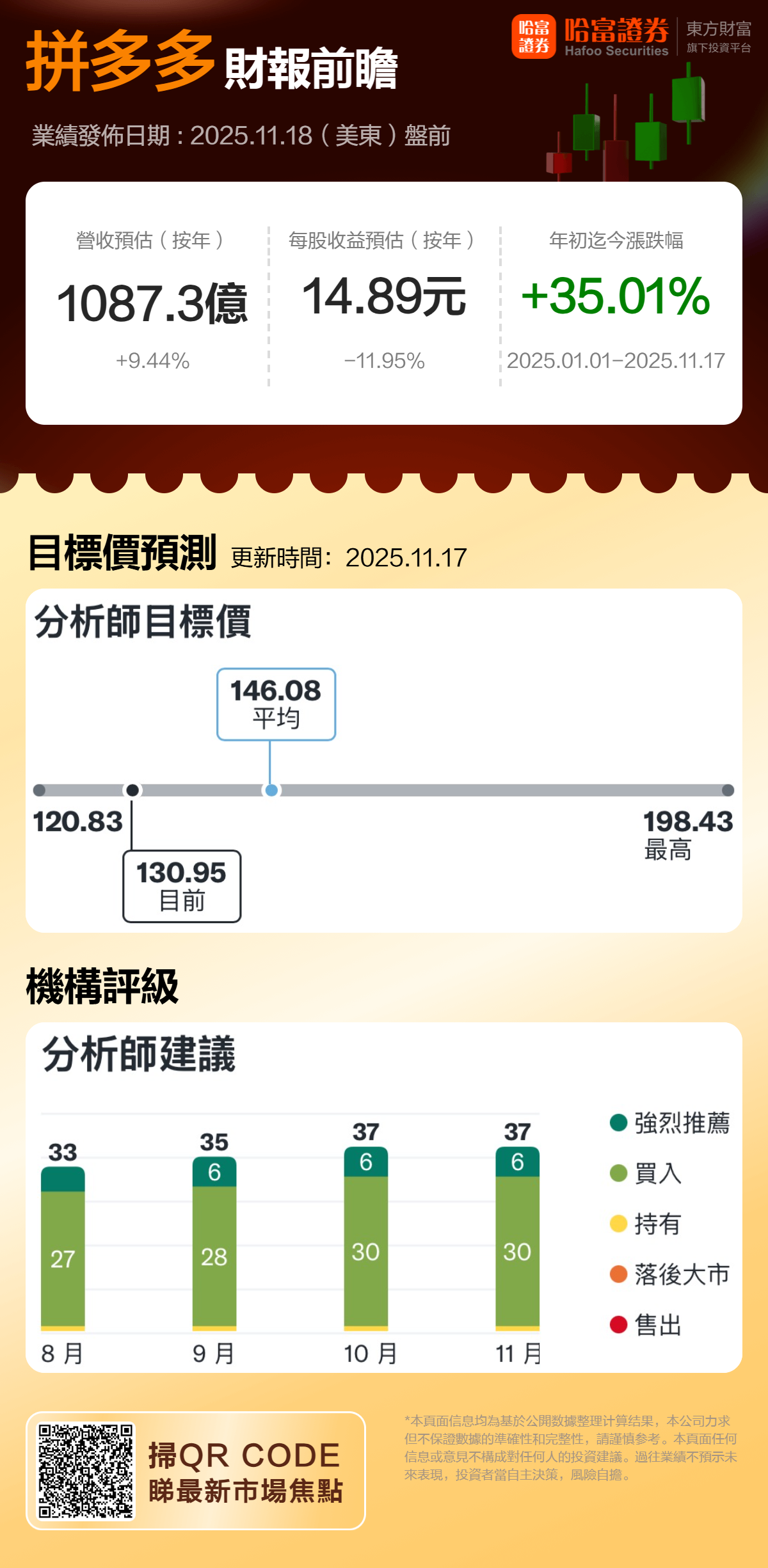 拼多多将于美东时间11月18日盘前发布财报。机构预期拼多多2025Q3预计实现营收1087.3亿元,同比增加9.44%;预期每股收益14.89元,同比减少11.95%。(上述数据使用的会计准则为US-GAAP)