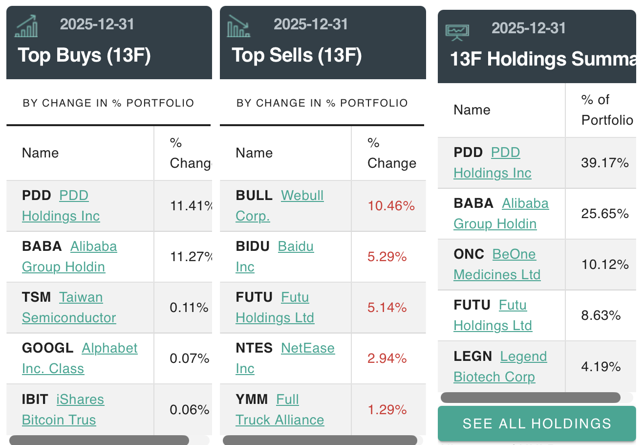 高瓴资本旗下专注于二级市场投资的基金管理平台HHLR Advisors近日披露持仓显示,四季度增持阿里巴巴、拼多多、iShares比特币、台积电;清仓百度;减持网易、富途控股、满帮、Webull等;重仓拼多多、阿里巴巴、富途控股等。