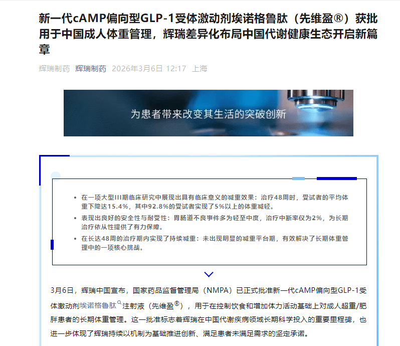 辉瑞中国:埃诺格鲁肽获批用于中国成人体重管理