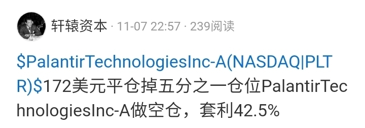 $Palantir Technologies Inc-A(NASDAQ|PLTR)$ 167美元平仓掉五分之一仓位Palantir Technologies Inc - A做空仓,套利54%。