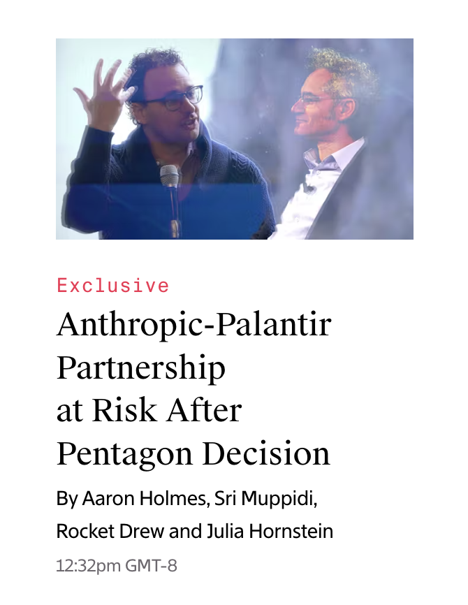 The Information:五角大楼的决定让Anthropic与Palantir的合作关系面临风险。