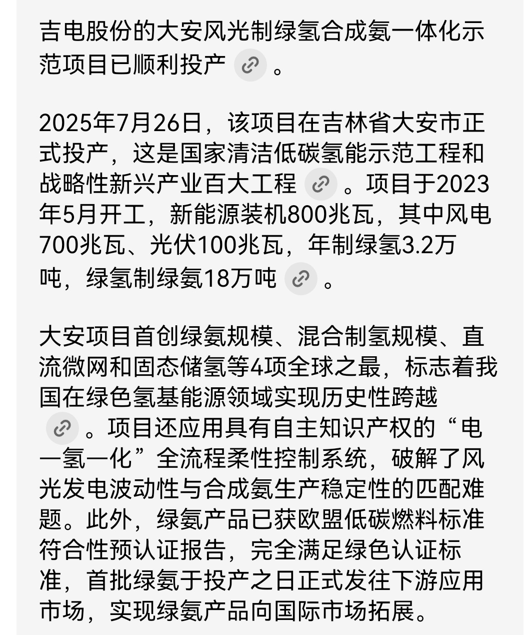 吉电股份绿氢,产绿氨形成全产业链。月产绿氢2766吨,约为老美的8倍。