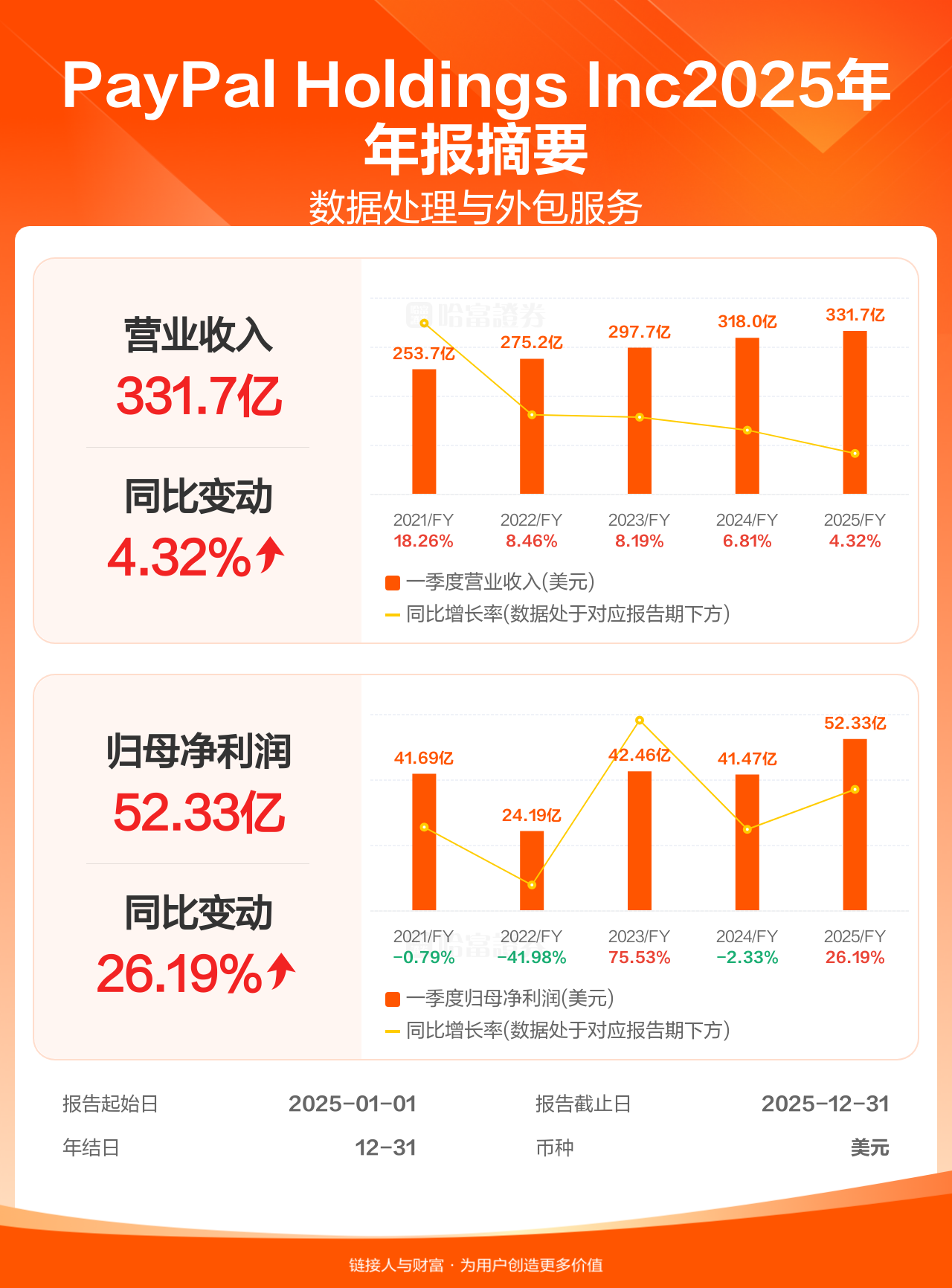 PayPal Holdings Inc2月3日发布年报业绩,截至2025年12月31日的12个月内,该公司营业收入331.72亿美元,同比增长4.32%;公司权益持有人应占溢利(归母净利润)52.33亿美元,同比增长26.19%。